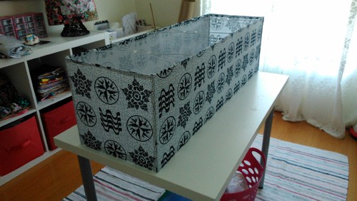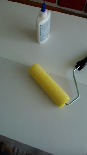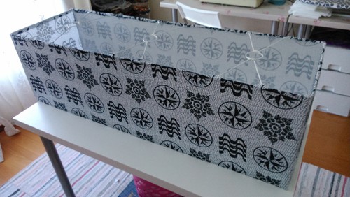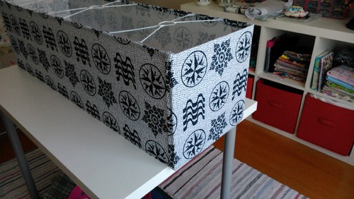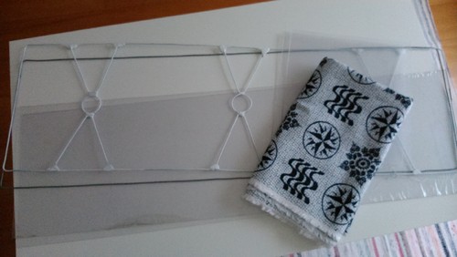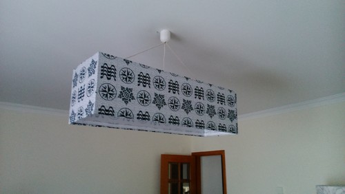 Para o abajur usámos placas de pvc/acrílico fininhas (compradas no AKI) e tecido pois claro. Algo diferente, tipicamente português e dentro dos tons da sala.